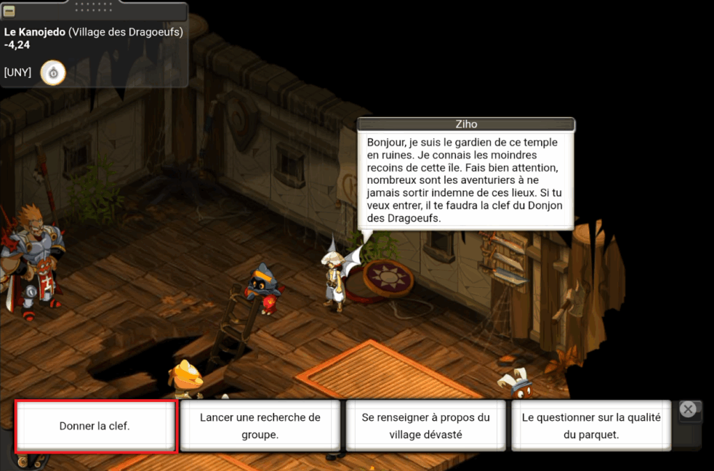 A l’intĂ©rieur, parlez Ă Ziho et donnez lui la clef du Donjon des Dragoeufs ou utilisez votre trousseau de clefs.