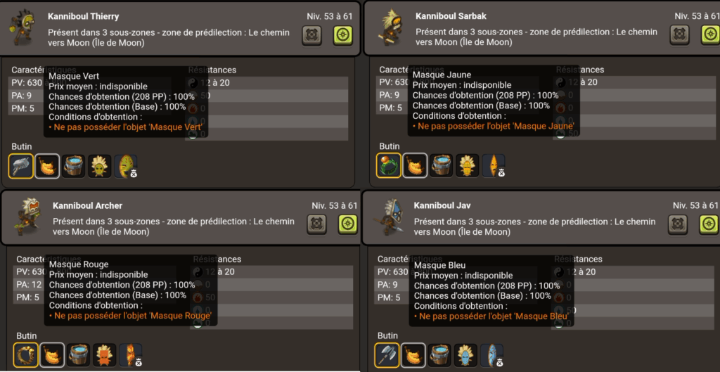 Papycha vous conseille alors de simplement réaliser les deux premières salles du Donjon Kanniboul afin de dropper simplement les 4 masques de couleurs (taux de drop à 100% avec Bonus Pack).