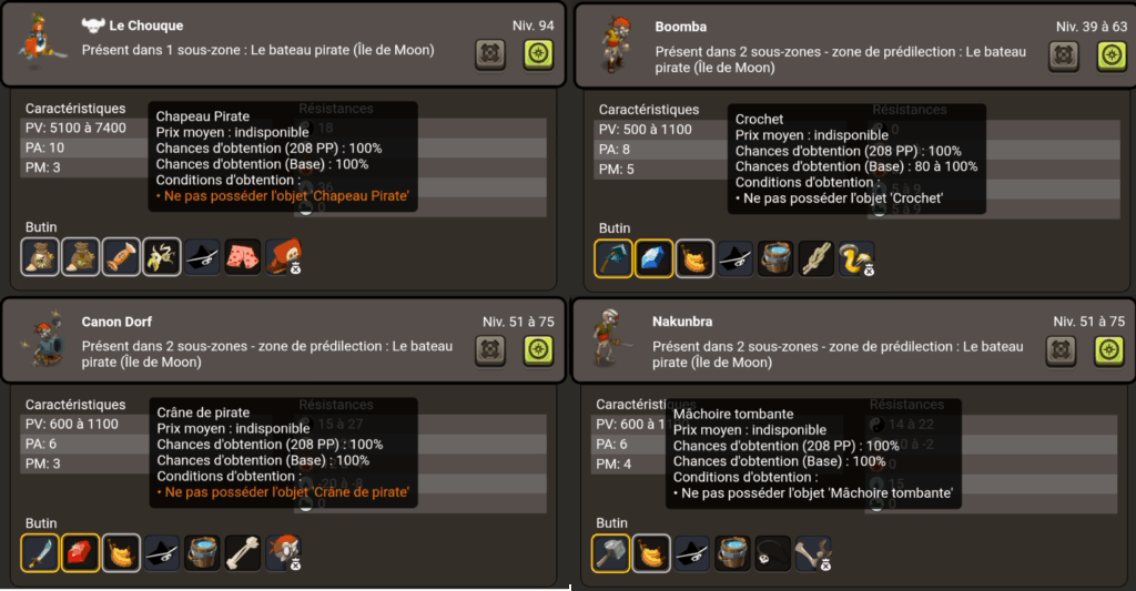 Une fois le Chouque combattu et son Chapeau Pirate droppĂ© (taux de base Ă 100% avec Bonus Pack), droppez si nĂ©cessaire le Crochet (Boomba), le Crâne de Pirate (Canon Dorf) ainsi que la Mâchoire Tombante (Nakunbra) en tuant des monstres Ă cĂ´tĂ© (taux de base de 100% avec Bonus Pack Ă l’exception du Crochet qui est Ă 80%, impactĂ© par la prospection et les challenges).