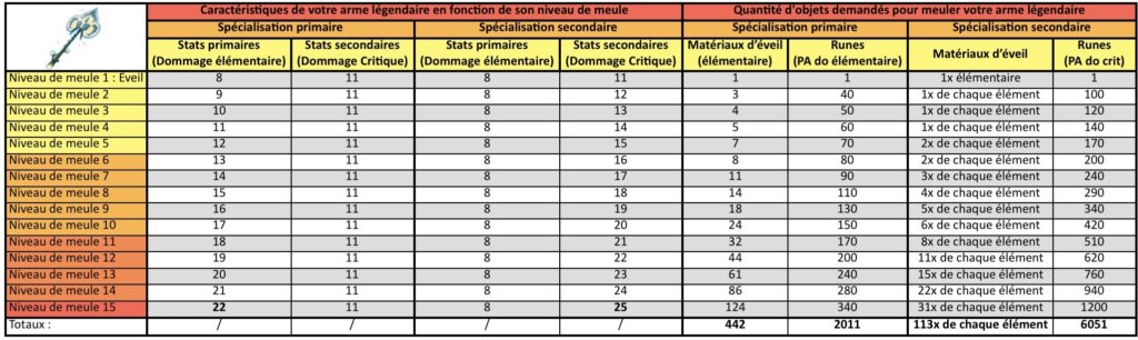 Meuler son Arme Légendaire n’est pas de tout repos, cette action nécessite une grande quantité de runes et de matériaux. Découvrez ci-après un tableau récapitulatif des caractéristiques de votre arme légendaire en fonction de son niveau de meule et des quantités d’objets demandés pour la meuler, bien entendu signé Papycha !